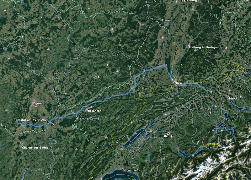 Gegen 19.30 Uhr am Abend des 25.08. fuhren wir los, um die übliche Strecke über die Schweiz und die Autoroute via Lyon und Clemnont-Ferrand Frankreich zu queren. Das Navi war sicherheitshalber eingeschaltet und sorgte auf der Schweizer Autobahn bei einem Abzweig für eine Abweichung vom Plan, die erst bei den nächsten Hinweisschildern auffiel. Die Navine schickte uns nicht wie üblich von Zürich über Genf, sondern über Basel. Hmm, eine kurze Überprüfung der beiden Routen ergab in etwa die gleiche Streckenlänge und Zeit, also ließen wir uns darauf ein. Mal eine andere Strecke war vielleicht auch nicht schlecht.