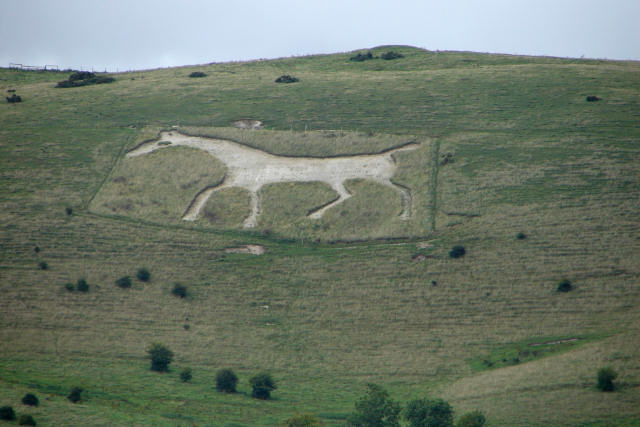 Obwohl schon fast alle Felder abgemäht waren, habe ich in Orcheston nach Kornkreisen gefragt, die in dieser Gegend zu finden sein sollen. Man verwies mich auf Avebury, dort sollte es noch welche geben. Also fuhren wir Richtung Norden, sahen aber keine Kornkreise. Etwas südlich von Avebury stießen wir dann auf ein interessantes Objekt, das Alton Barnes White Horse. Wird die Grasnarbe über meist weißem Kreideuntergrund an einem Berghang abgetragen, entstehen weithin sichtbare Zeichnungen, in diesem Fall ein White Horse.