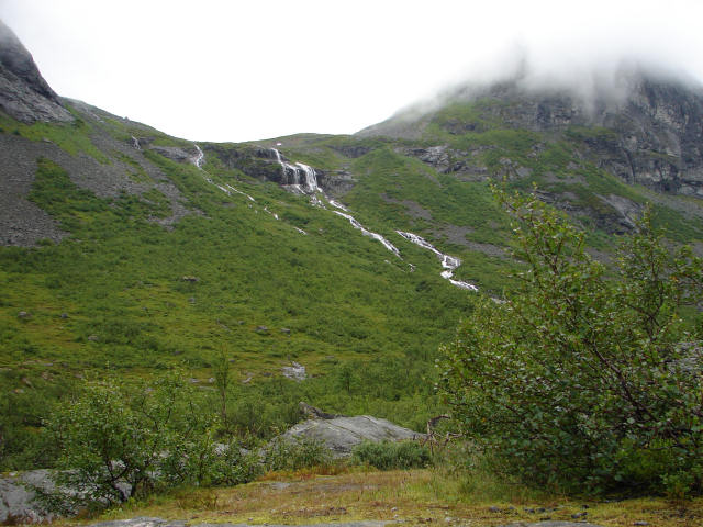 In Sjøholt trennten sich unsere Wege bis Andalsnes. Während unsere Freunde an der Küste entlang fahren wollten, nahmen wir die N63, um über den Trollstigen ans Ziel zu gelangen. Je höher wir gelangten, desto nebliger wurde es, bis wir schließlich am Trollstigen fjellstove kaum mehr die Hand vor Augen sahen und im Blindflug fast den Parkplatz verpassten. Ein Smørrebrød mit Lachs und Krabben sollte über die schlechten Witterungsverhältnisse hinweghelfen, was leider nur zum Teil gelungen ist. Gott sei Dank riss der Nebel etwas auf, so dass wir den Trollstigen hinab wenigstens den Stigfossen zu sehen bekamen.
